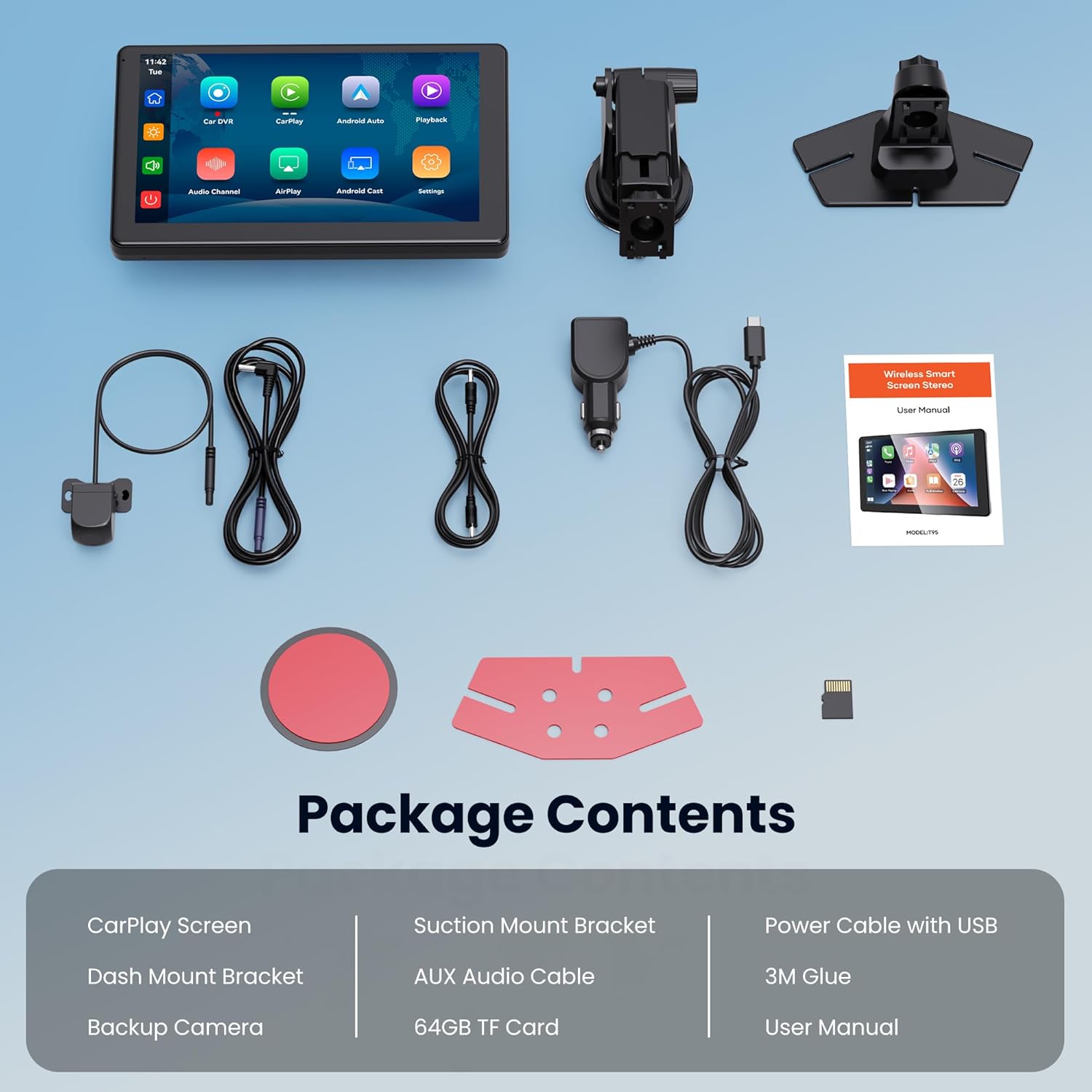 | BuiltIn Media | 5.5m extension cable;AUX Cable;Adhesive bracket;Suction Cup Bracket;Suction Pad, Portable Car Stereo, Type-C Car Charge;Rear Camera(Includes two screws and a sticker), User Manual;TF Card |