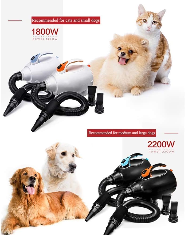 IS THE DRYING SPEED FAST Many people who wait and see and want to buy a water blower may ask such a question. The water blowers in other stores can have 2800W. Why is your shop so Yes, our power is only 1800W and 2200W, we do not fight for power, because we just want to make a safe and stable water blower. Specifications: Type:Blower Type of Pet:Cat, Dog Voltage: Function:Stepless speed change Power:1800W-2200W Blowing force:1800W:660g;2200W:780g Room temperature:52-54 ℃ Colors:Black size:40*27.5*29cm #About Noise # We racked our brains and could only keep it as low as a few decibels, but never heard a sound; But let pets do not exclude this voice, there may be a fixed strategy here. 1.Remove the mouthpiece and blow: Remove the head when blowing, the sound is almost the same as a hair dryer, and the hose is straightened. The wind and the wall of the pipe are short and the noise is significantly smaller. Basically, only the sound of the wind is heard. 2.Small warm-up, step by step: First heat the water blower for 5 minutes. First, pre-heat it in small gears to make the machine and temperature reach the best working condition. Second, let your pet slowly get used to this air volume and let it increase slowly afterwards. 3.Height and reward comfort: Letting pets stay in a higher place, while blowing can give pets some snack rewards to appease and slowly eliminate pets' anxiety.