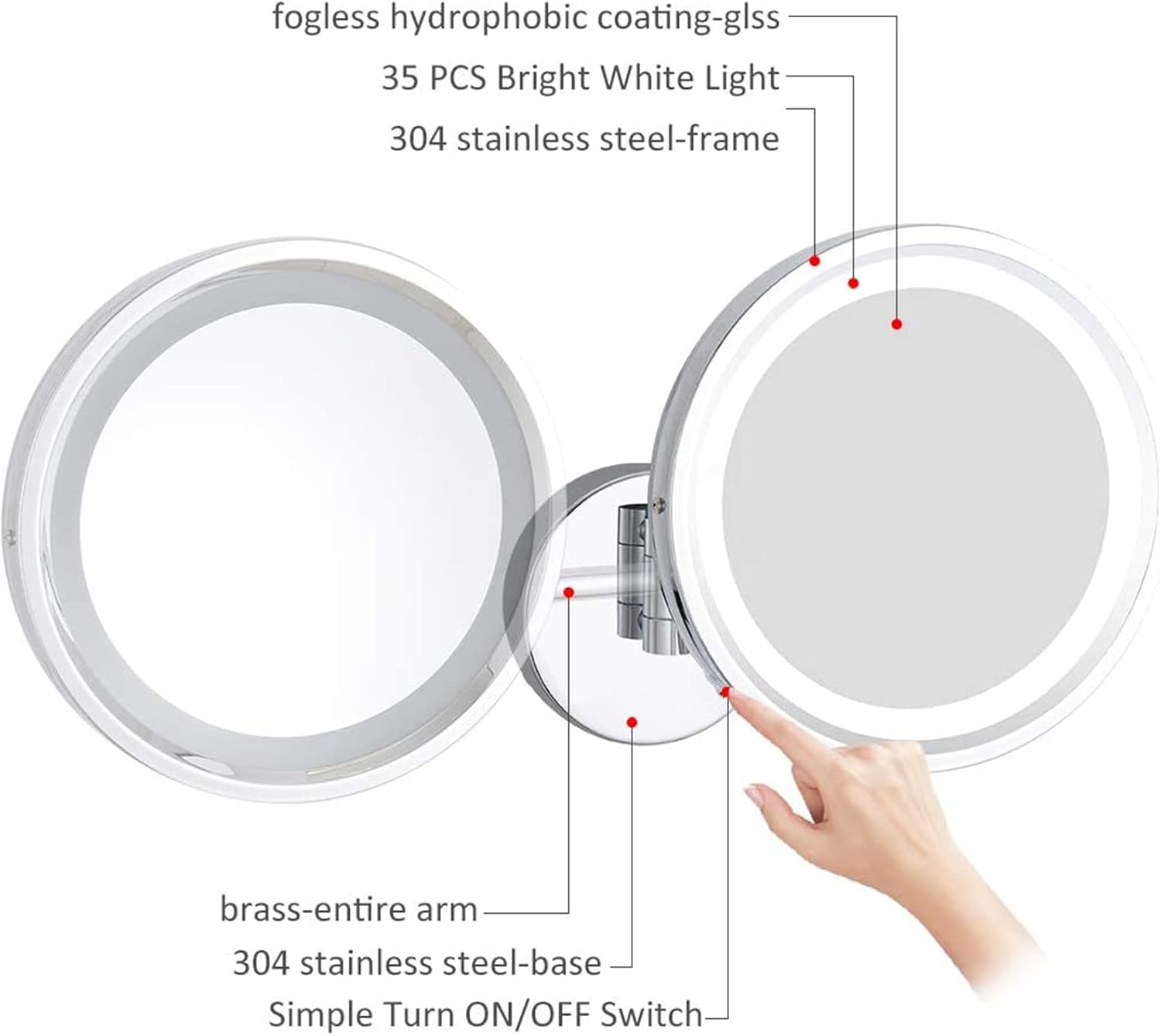 Makeup MirrorsItem Type: LED Lighted Makeup MirrorType: Adjustable Wall Mounted Shaving Vanity MirrorStyle: ModernColor: Chrome, Black, Brass, Rose gold, Gold, NickelInput voltage: AC: 85~265VLighted: YesMaterial: Brass + Stainless steel + GlassFeature: illuminated, 1-face, magnifying, dual arm extend360 Degree Rotated Mirror: Easy to adjust the angle you wantSingle sided: MagnifyingMagnification option: 10XShape: RoundMirror Size: 8 Inches (20cm)Telescopic Range: 26.5cm-41.5cmPowered: Hard-Wired, Plug-InSwitch: Smart Sensor SwitchInstallation Method: Wall-MountedLED Life: 10,000 HoursLight Luminance: 6,500KWarm reminder:The project may be slightly different from the image due to the display of lights and screens.
