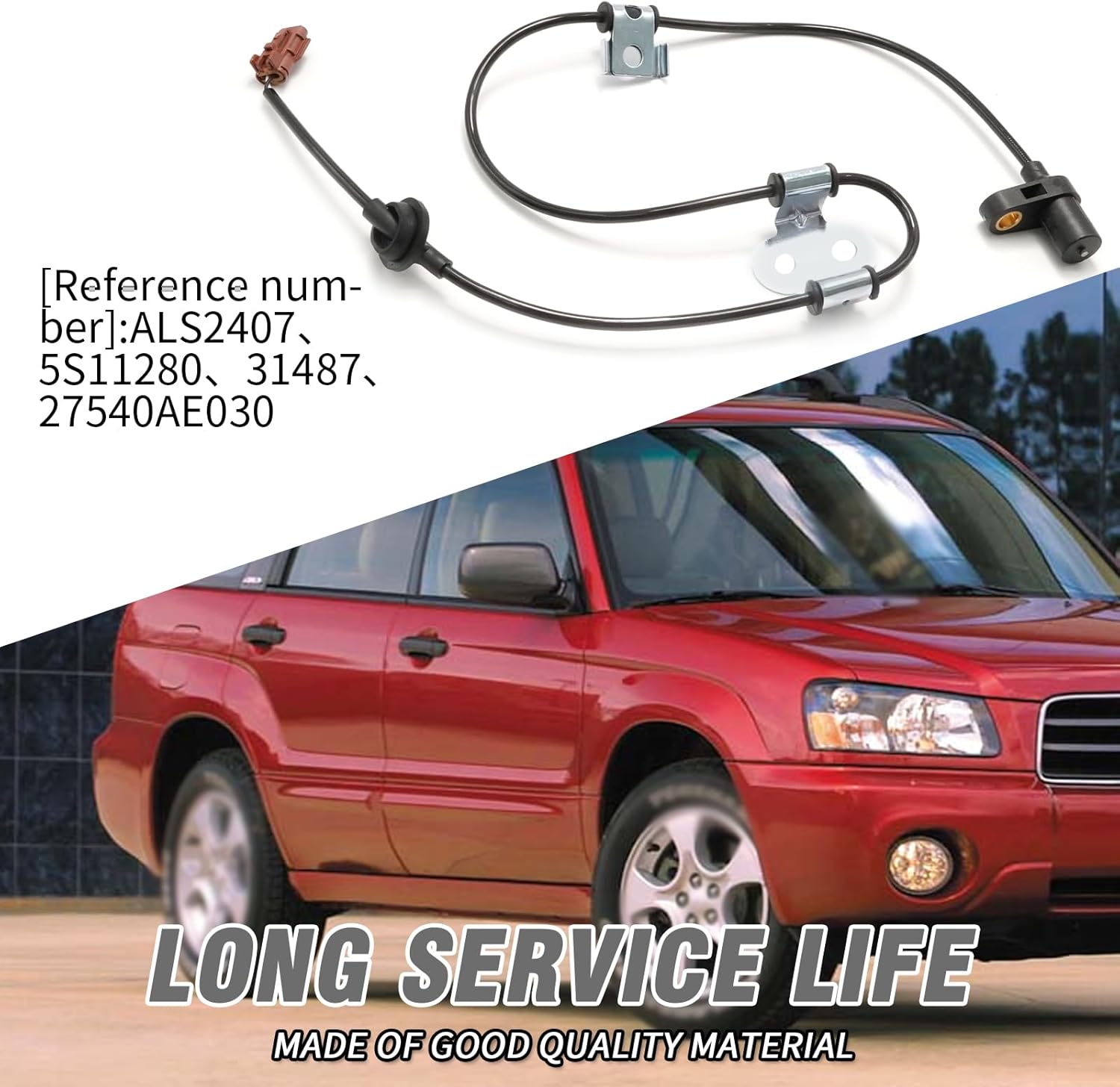 Product Type: ABS Wheel Speed Sensor Fitment: Replacement for Subaru Forester 2003 Replacement for Subaru Forester 2004 Replacement for Subaru Forester 2005 Replacement for Subaru Forester 2006 Replaces Part Number: ALS2407, 5S11280 31487, 27540AE030 Location: Front Left Driver Side Material: Plastic Performance Features: Long lifespan Accurate wheel speed readings Installation: Designed for easy installation