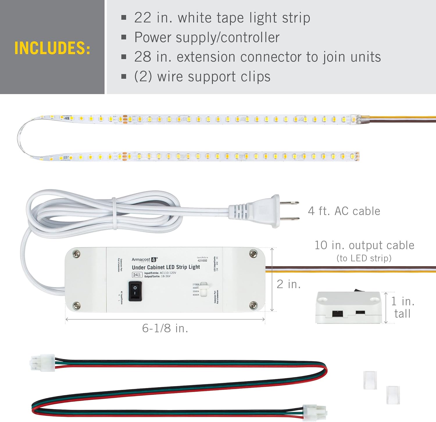 | Included Components | (2) wire support clips, Extension connector to join units, Power supply/controller, Tape light strip |
