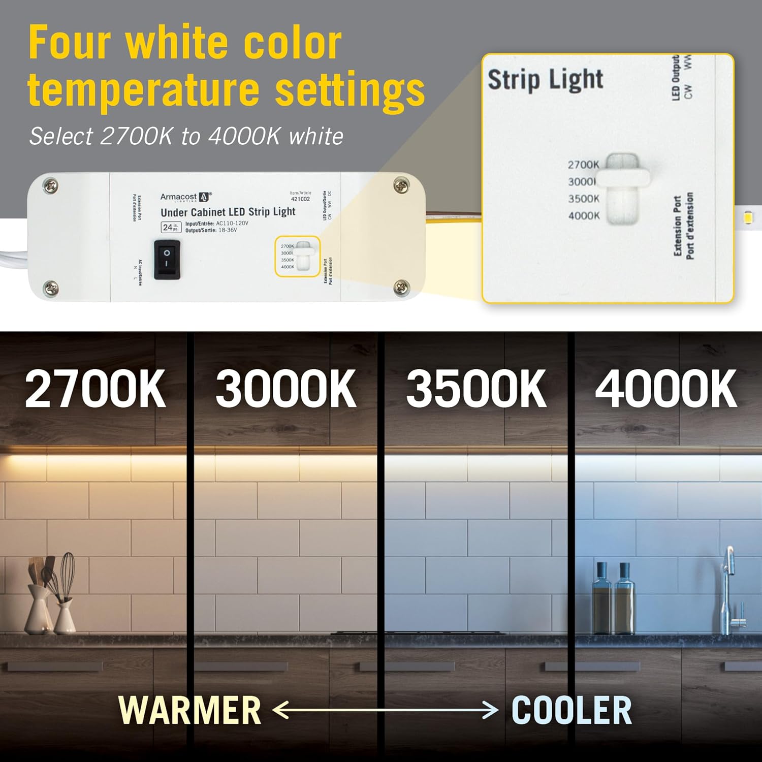 Replace your outdated under cabinet kitchen light fixtures with flexible LED strip lights, designed to fit 12, 24, and 36 inch cabinets. CCT tunable white under cabinet light strips can be hardwired and also come with a plug-in power supply that includes a toggle on/off switch and color temperature switch to adjust between 2700K-4000K. Adhesive LED strips can be easily installed in place of existing under cabinet light fixtures with 120V kitchen wiring and can be paired with compatible dimmer switches for smooth dimming control. Different strip light lengths can be interchanged and connected using included linking cable to create custom length installations. LED strip lights are a convenient, energy-efficient alternative to fluorescent under cabinet fixtures and bulky light bars. Add a touch of elegance to your kitchen aesthetic with White CCT Tunable Under Cabinet Lighting LED Strip Lights from Armacost Lighting.