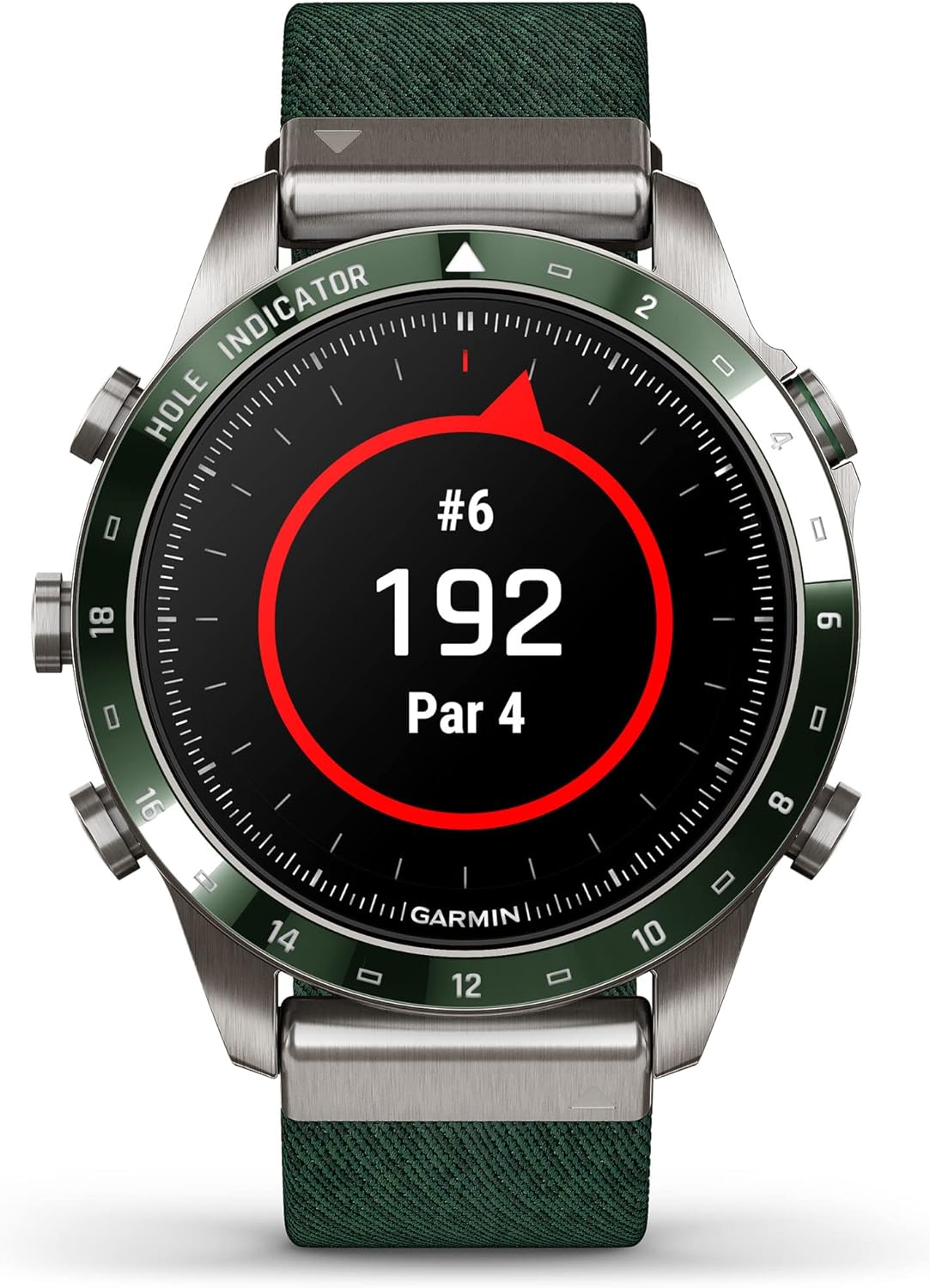 Showcase your passion for golf with this luxurious, modern tool watch. It boasts a tritone green jacquard-weave nylon strap, a captivating AMOLED touchscreen display with traditional button controls, and a 46 mm Grade-5 titanium case for exceptional durability. With 42,000 preloaded courses and multiple hole overview features, the MARQ Golfer (Gen 2) Watch is an ideal companion for your golf game.